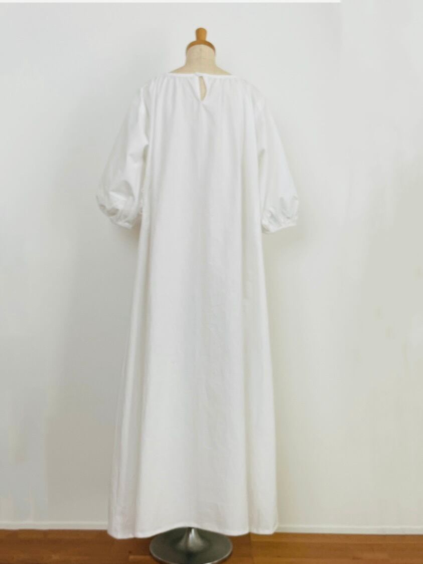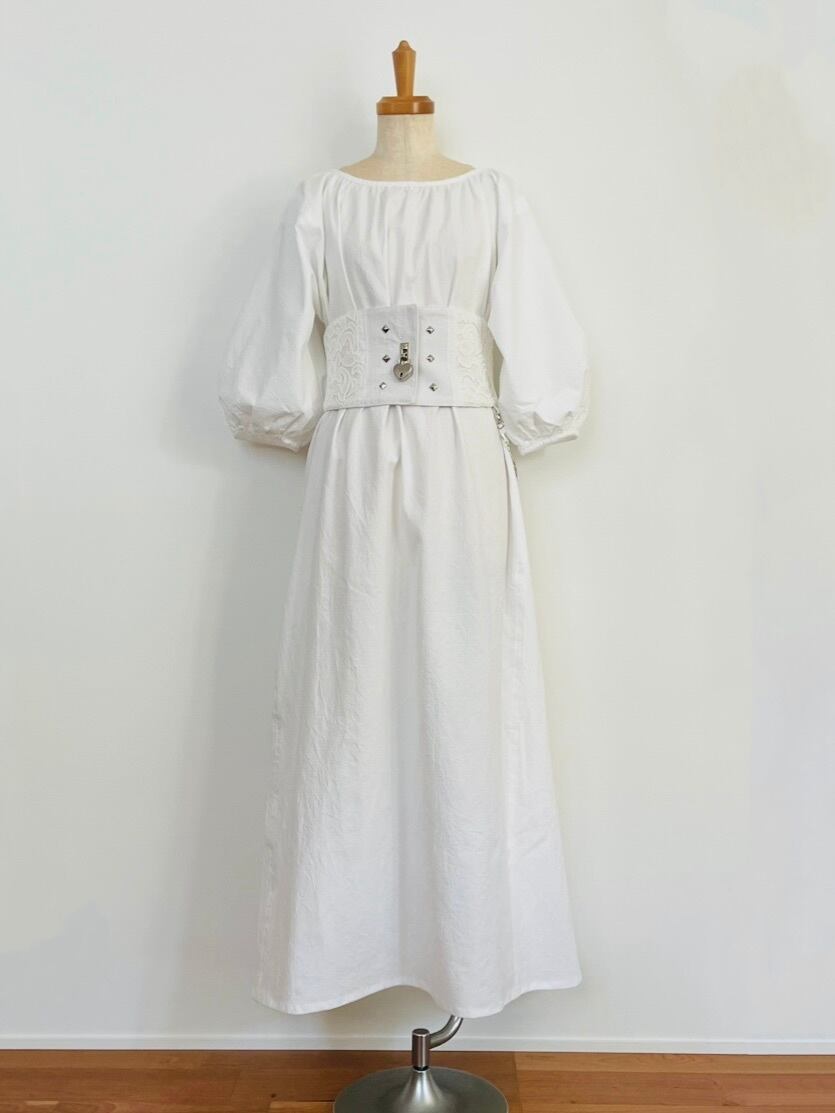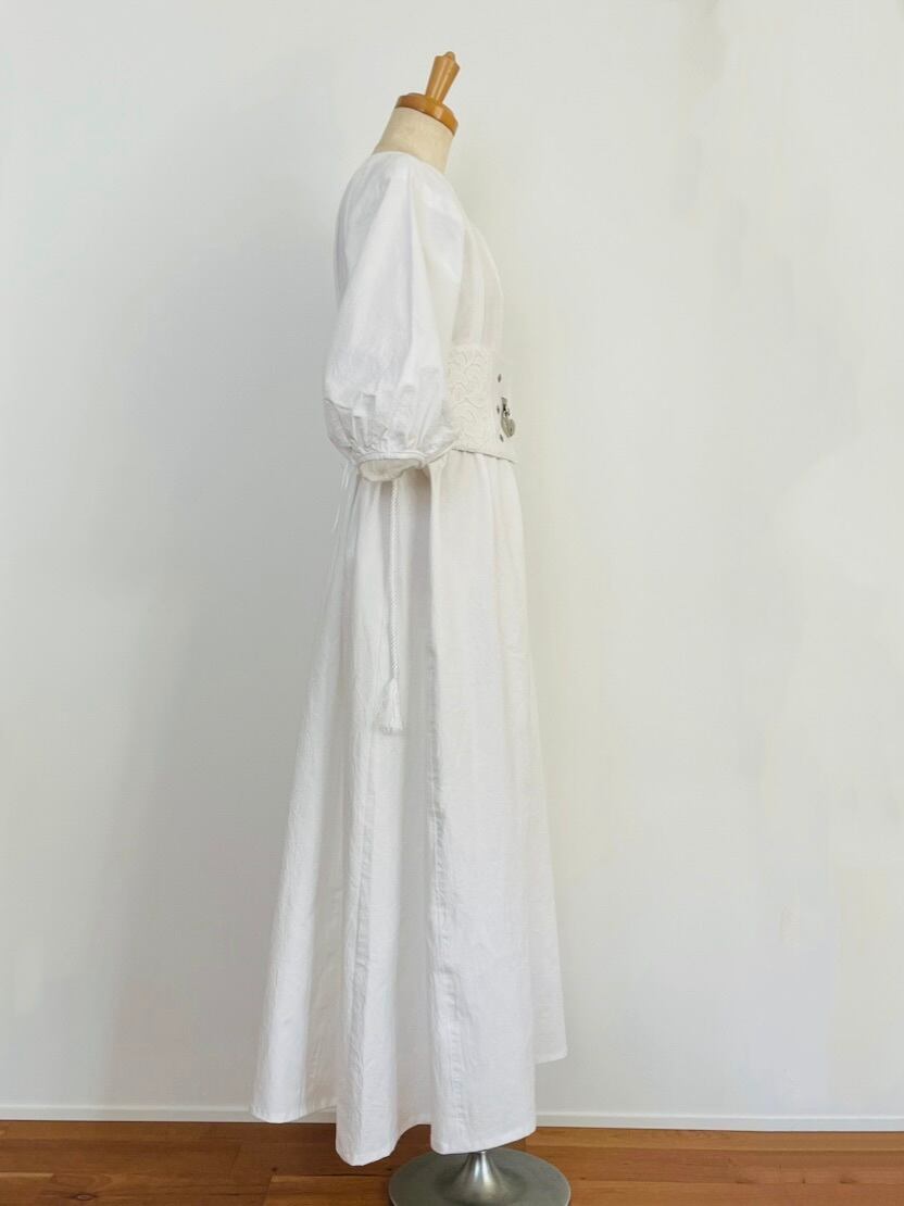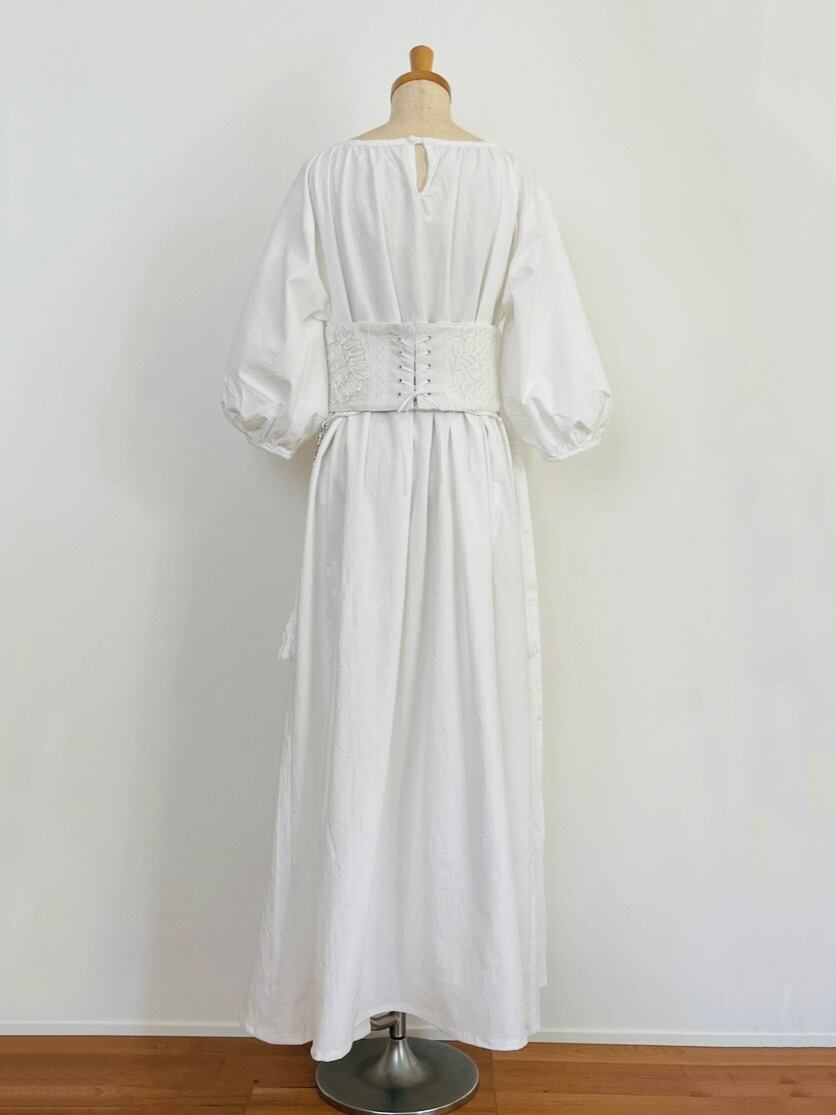 このドレスは、贅沢にタイシルクを使い、ふんわりしたそでとコルセットで