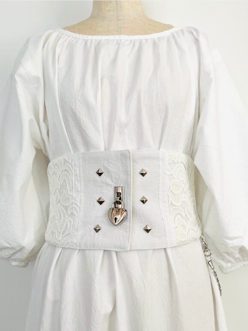 付属のコルセットはレースやスタッズを使い、前はハートの南京錠の金具、後ろは編み上げになっていてサイズ調節が可能、前から見ても後ろから見てもかわいいです。